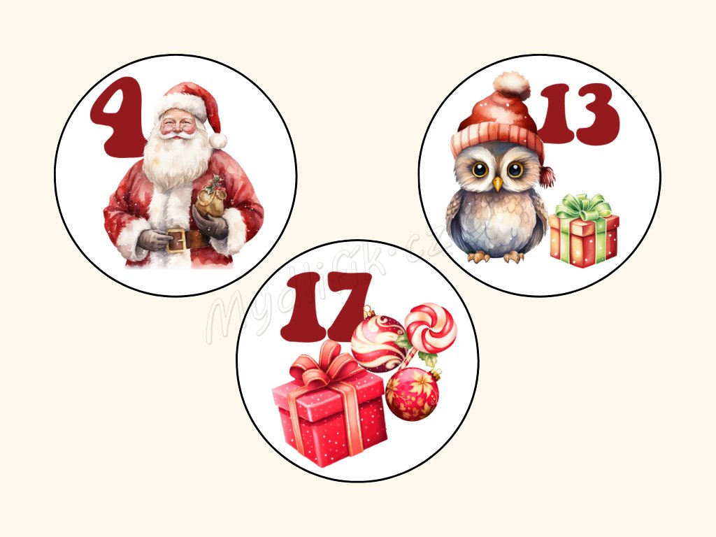 Na archu velikosti A4 najdeš 24 kulatých samolepek o průměru 4 cm, očíslovaných od 1 do 24 – ideální pro adventní sáčky, krabičky, obálky nebo jiné DIY nápady.