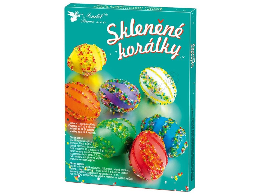 Barvy vystačí přibližně na 18–24 vajíček, korálky na 3–4 bohatě zdobené kraslice.