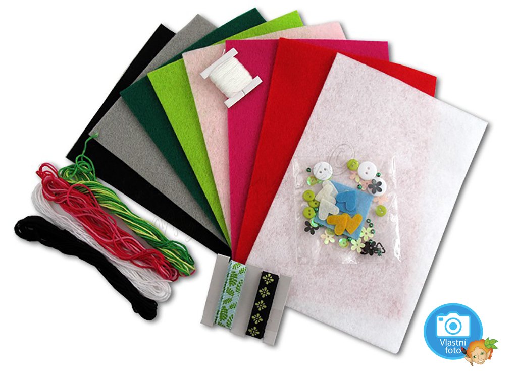 - 8 kusů filcu (bílá, sytě růžová, červená, světle růžová, světle zelená, tmavě zelená, šedá a černá)